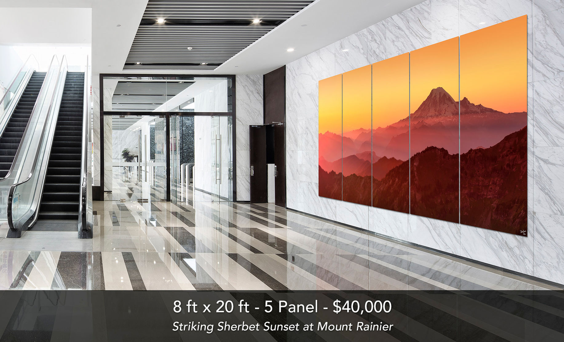 At sizes from 6 to 20+ feet wide, this oversized art brings a huge wow factor and the presence of nature to any room. Full scale triptychs and 5 panel prints of the stunning Pacific Northwest landscape make unforgettable large wall decor for homes, businesses, and public spaces. Peter James is the only photographer in Washington State who has mastered printing at this scale while maintaining ultra-high detail.