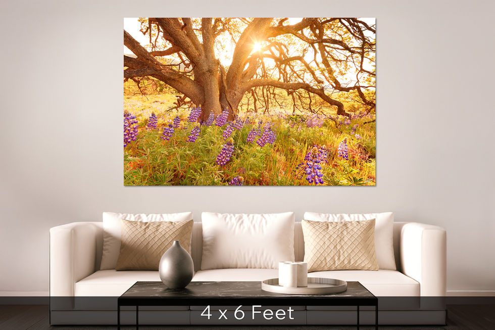 Lupine wildflowers flourish in the shade of a massive Oregon Oak in the Dalles Mountain Ranch portion of the Columbia Hills State Park.