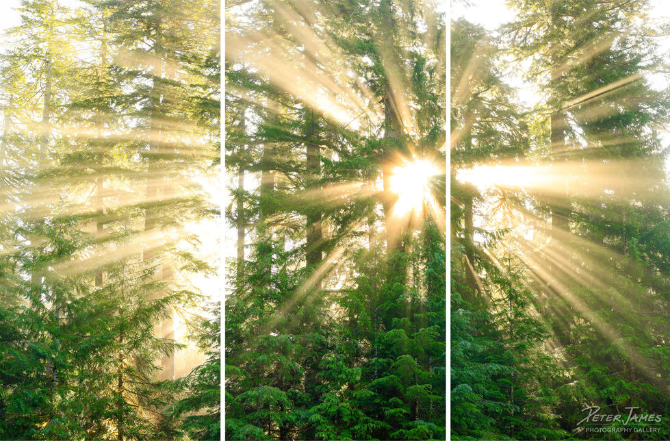 When shooting rainforest photographs that will be be printed as extra large wall art, like my triptychs and 5 panel prints, my goal is to capture subjects that are huge in scale. This old growth forest certainly fit that description as it towered over and around me. And the glory of the sunlight pouring in is a powerful metaphor for how many time beauty comes from within. This profound subject printed as oversized wall art will certainly transform any space into a sanctuary of life and beauty.