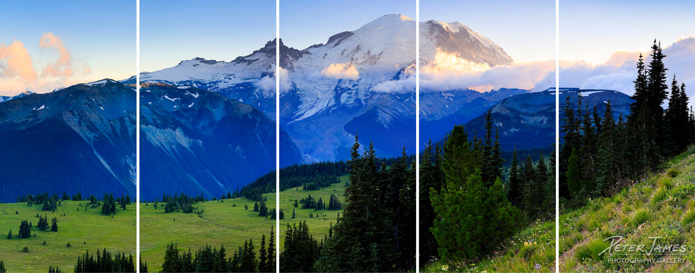 Standing eye level with Mount Rainier’s massive glacier covered peak as the last rays of sun cast warm light upon the clouds that try to encircle it.