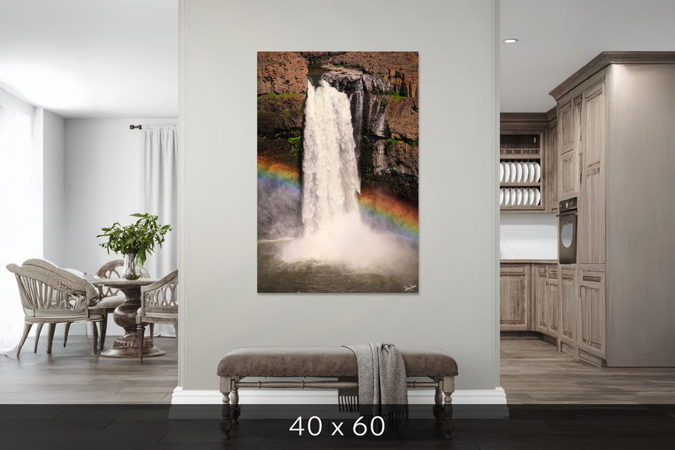 There are really two approaches to creating great fine art waterfall photography, using long exposures to make the flowing falls look smooth and silky, or using a very fast shutter speed to stop the motion of the water entirely. Most casually taken waterfall pictures are in the middle somewhere and the water is blurred but not smooth. As a Pacific Northwest landscape photographer, I much more commonly use the long exposure method to create smooth and dreamy waterfall art in my forest nature photography for sale, but this sunny day at Palouse Falls State Park was the perfect day to stop the motion with a 1/2500th of a second exposure when capturing this fine art rainbow waterfall wall art print.
