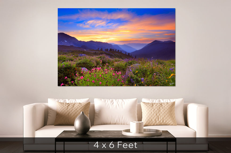 I captured this wildflower mountain photography wall art print on the Ptarmigan Ridge Trail near Mount Baker in late August 2018. The majority of the trail is open talus (rock) fields with little vegetation. This spot has a little creek flowing through it which creates this showy burst of wildflowers, making it a perfect fine art mountain photography location.