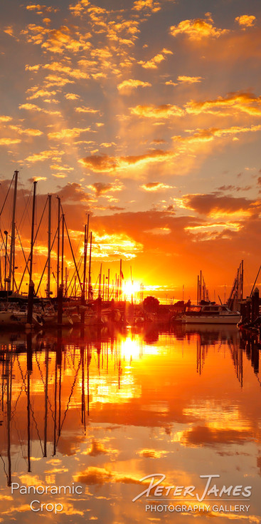 A spellbinding sunset fills Squalicum Harbor in Bellingham Washington with golden light and spectacular sky and sailboat reflections.