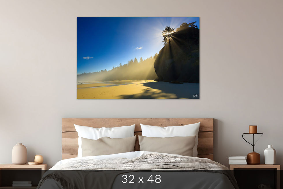Surely one of the best parts of backpacking is seeing the wilderness in the beautiful morning light. The Olympic Coast beach photography for sale here was taken on Shi Shi beach in September of 2012 on a solo backpacking trip I took there. It was cloudy and rainy for the two days leading up to this, so waking up to blue skies, I was ecstatic. Even more exciting was the thick coastal mist that stretched down the beach capturing the sunlight in the vibrant beams shown in this fine art Pacific Northwest beach photography wall art.