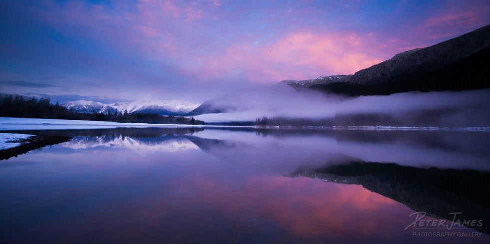 Rich twilight purples stand out from the low hanging evening clouds that drape Anderson Mountain and Mount Shuksan above Baker Lake in this panoramic photograph.
